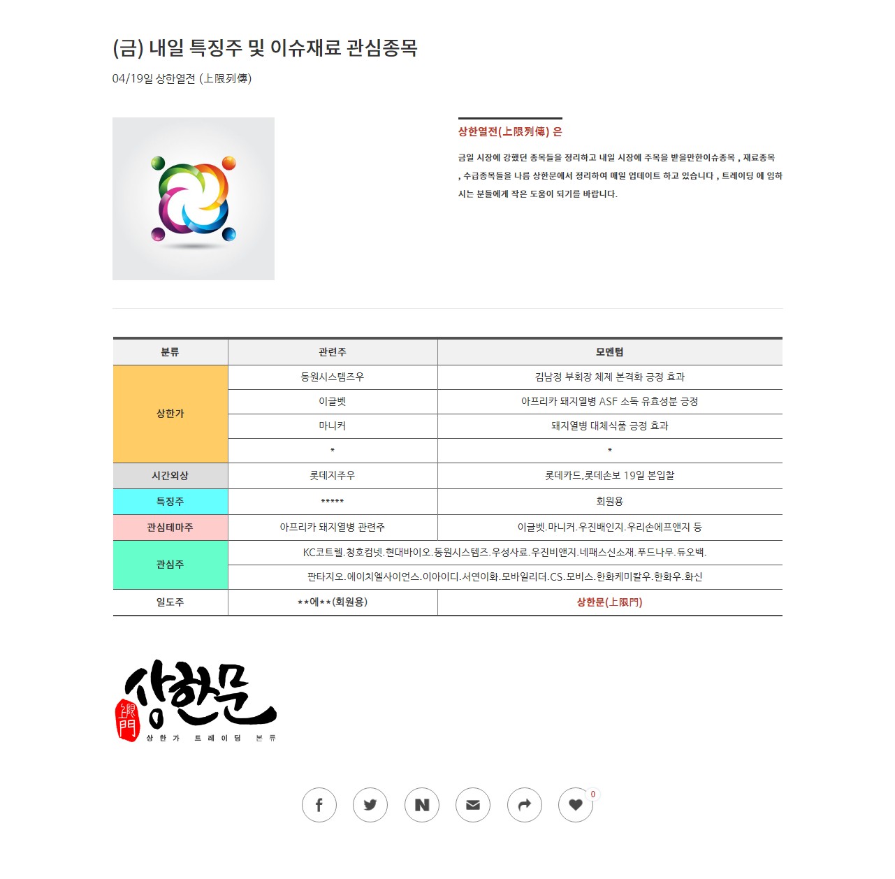 | 4월18일(목) 상한열전 - 내일 특징주 및 이슈재료 (0) | 2019.04.17 |